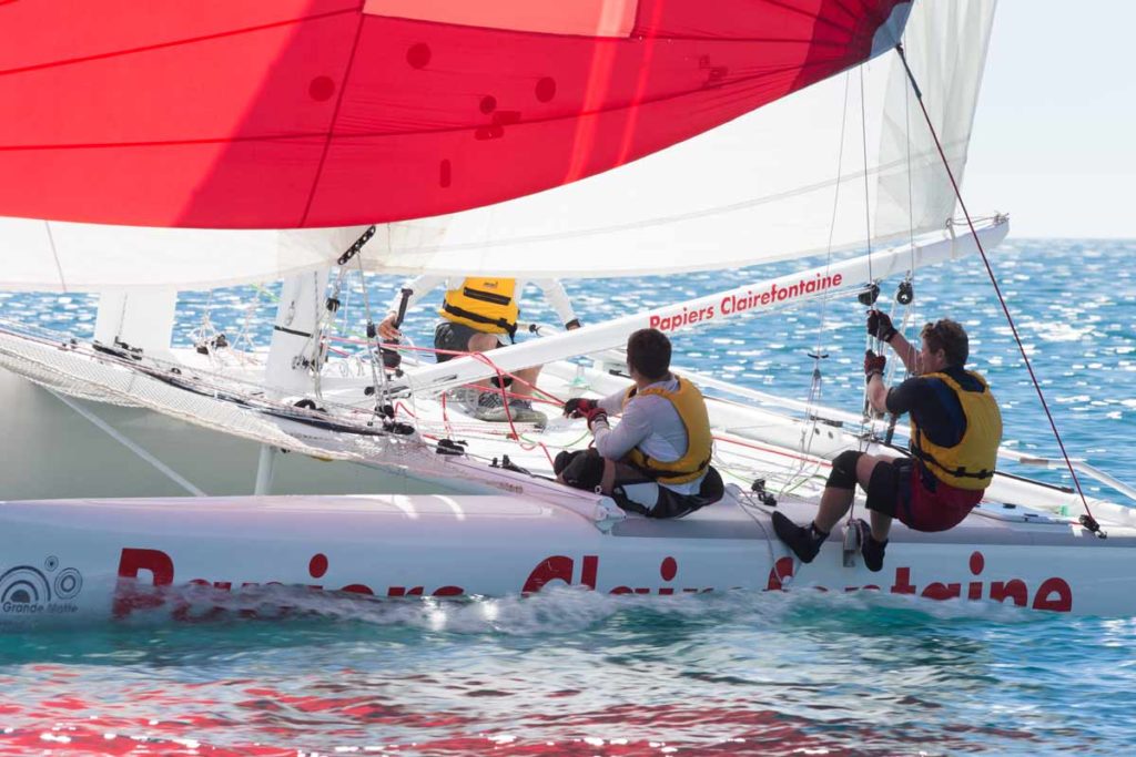 La flotte de 8 catamarans de 25 pieds monotypes (c’est à dire tous absolument identiques) a été construite par la société Sailing One.